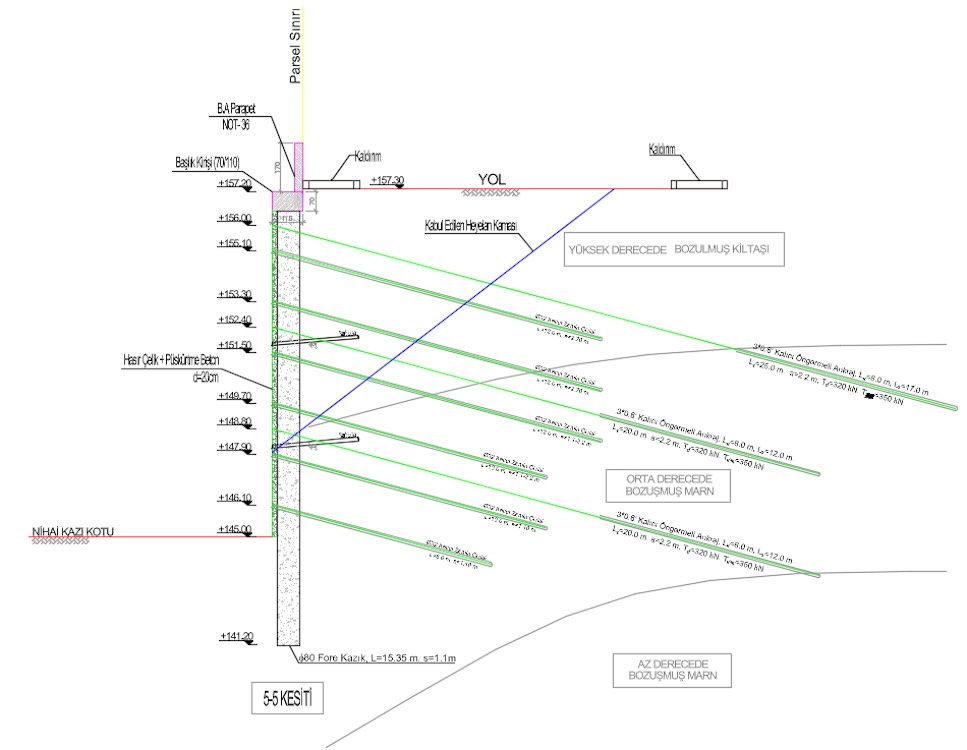2025 yılında Mersin Tarsus’ta yer alan Amiblu Turkey sahasındaki temel kazısının güvenliğini sağlamak amacıyla kalıcı iksa projesi hazırlanmıştır. Sahadaki zemin koşulları ve meydana gelen heyelan problemi analiz edilerek; Ø80 cm çapında fore kazıklar, Ø32 mm kalıcı zemin çivileri, 3*0.6" kalıcı öngermeli ankrjalar ve 20 cm kalınlığında püskürtme betondan oluşan kalıcı iksa sistemi tasarlanmıştır.
