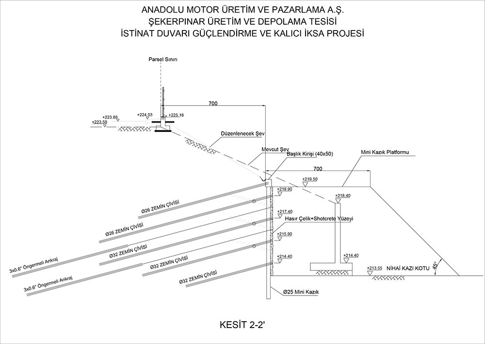 Gebze'de H=8-13 m değişen yükseklikte şev/ iksa aynası için dik zemin çivisi uygulaması ile kalıcı iksa yapılmıştır. Mevcut bir betonarme istinat duvarı kalıcı öngermeli ankrajlar ile güçlendirilmiştir. Bu projede toplam 2.000 m kalıcı öngermeli ankraj, 600 m² zemin çivisi ve 650 m mini kazık imalatı tamamlanmıştır.