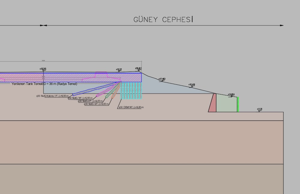 To increase the soil bearing capacity, Ø30 cm Mini Jet Grout columns and Mini DSM columns at different angles were designed within the scope of the project.