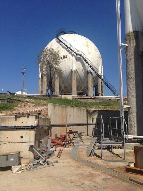 Stability checks and liquefaction analyses were performed for the Spherical Tank 204, and ground improvement projects were designed. In this process, the existing ring foundation was converted into a raft foundation by extending it 3.90 m; due to the structure approaching the sloped area, bearing capacity, settlement, and slope stability analyses were renewed.