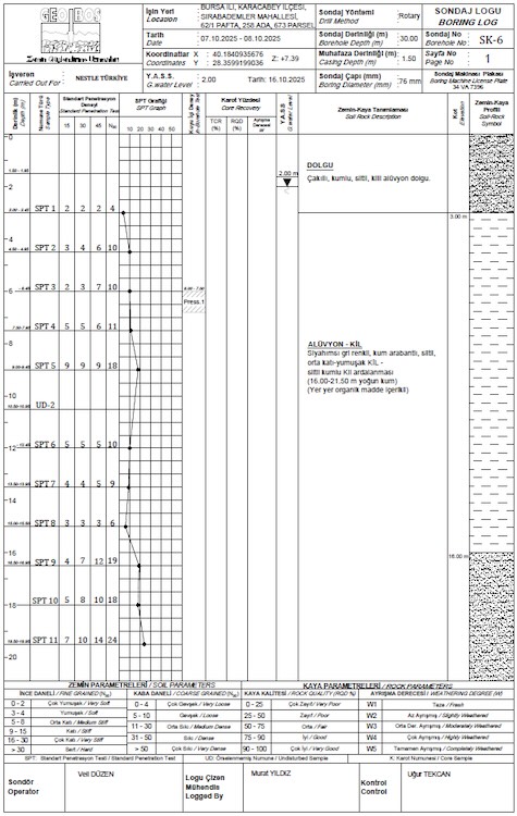 In October 2025, soil investigation works were carried out to determine the soil conditions at the Nestle Warehouse Structure site planned to be constructed in Bursa Karacabey. In this process conducted by us, a total of 6 boreholes, each with a depth of 30.00 m, were drilled on the site, and the soil profile was analyzed via geophysical test measurements. In the Soil and Foundation Investigation Reports prepared by us, settlement risk and potential liquefaction status were examined.