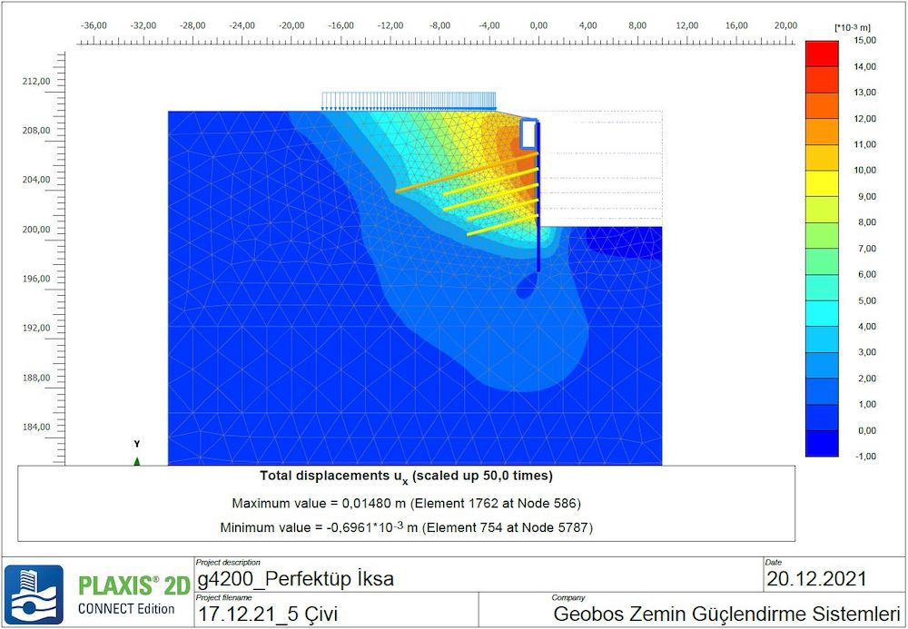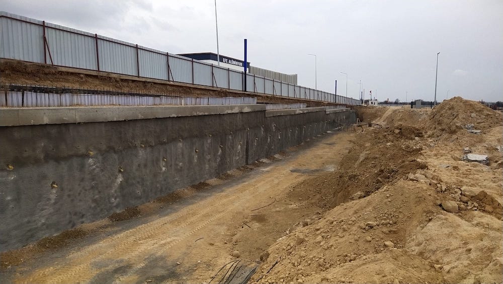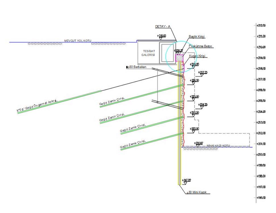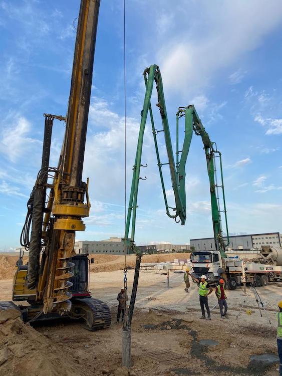 Within the scope of ground investigation studies, a total of 1,140 m of borings at 25 m and 35 m lengths, laboratory tests and geophysical measurements were carried out on the samples taken from the borings. Within the scope of ground improvement works, a total of 10,419 m (ϕ65/80 cm) bored piles were installed under the foundation of the factory structure. In the shoring project with a maximum excavation height of 8.5 m: 2,800 m (ϕ30 cm) mini piles for permanent shoring and 3,618 m of permanent ground nails were undertaken. In 2023, a total of 1,860 m (ϕ80 cm) bored piles and 3,500 m (ϕ65 cm) concrete columns (unreinforced bored piles) were constructed in the Chemical Storage area.