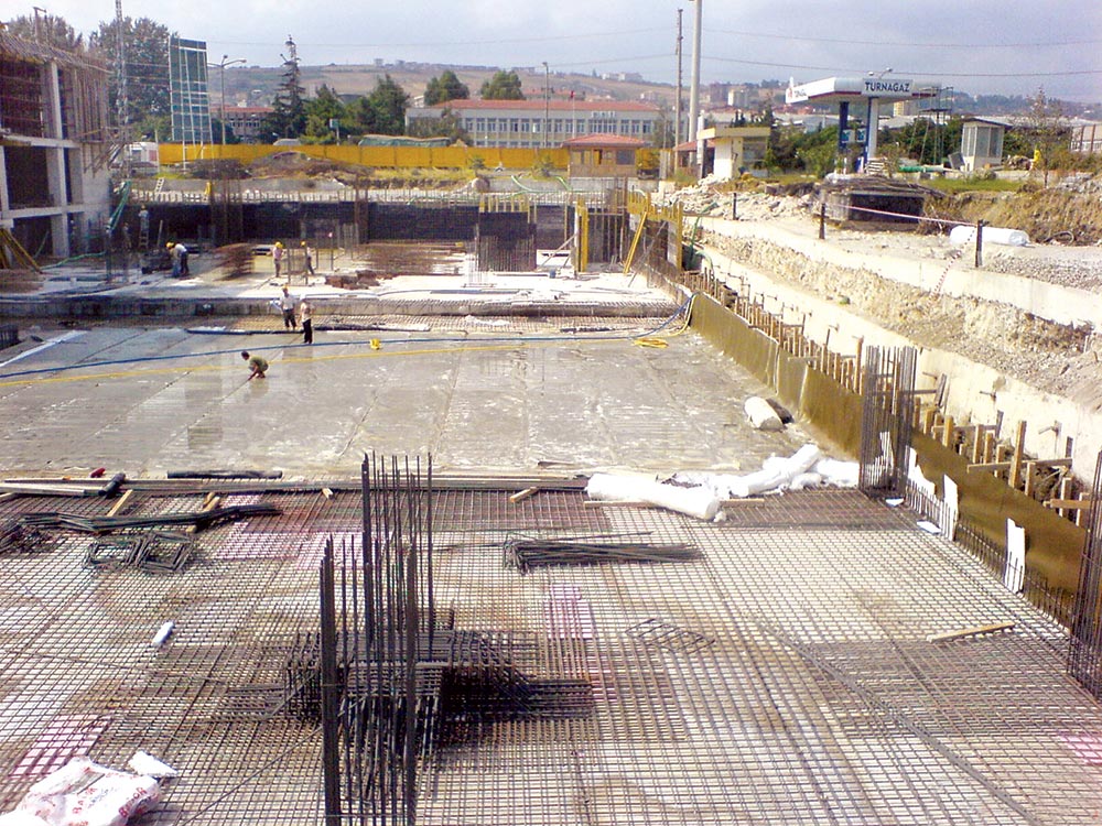 In Atakum, Samsun, a basement excavation with a base area of about 5.800 sqm (77 m x 75 m) and of a 4,50 m depth; has been designed and constructed by a jet grout cutoff wall.