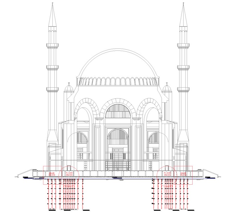 The ground improvement design of the Sanko Mosque project was planned within the framework of academic cooperation established with METU faculty members and implemented in the field. In line with this cooperation; discontinuities and voids in the soil profile were filled with 20,280 m of packer injection, consisting of 676 units with a diameter of Ø125 mm.